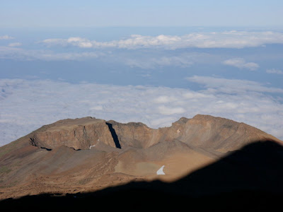 Alle Augen richten sich jetzt auf die andere Seite des Berges. Dort wächst der riesige, dreieckige Schatten des Vulkans weit über die Insel hinaus aufs offene Meer. Aus den über 2.000 Meter tiefer gelegenen Wolken ragen andere Kanarische Inseln: La Gomera, Gran Canaria, Fuerteventura, El Hierro.
